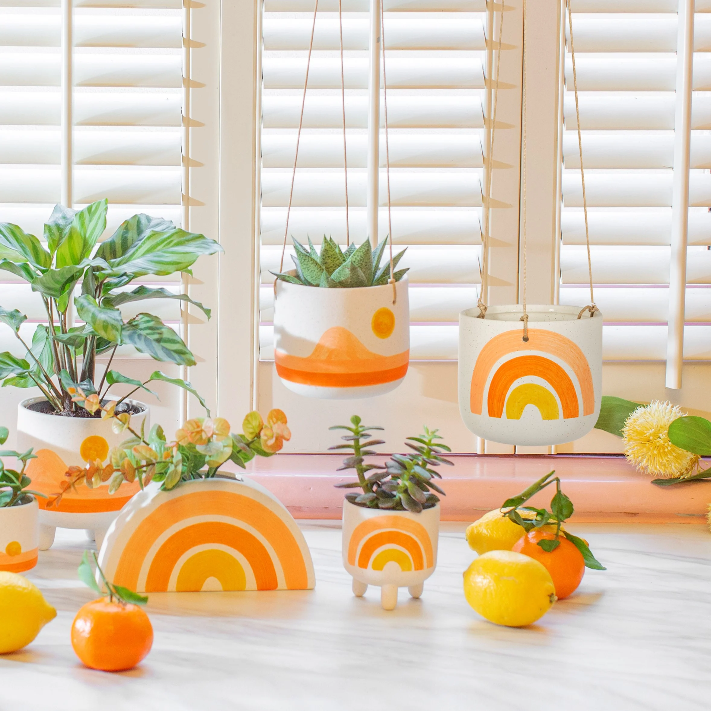 Part of our Sunsets & Rainbows collection that sits within our large range of wholesale planters. Featuring a rainbow design of sunset hues in peach, orange and yellow.